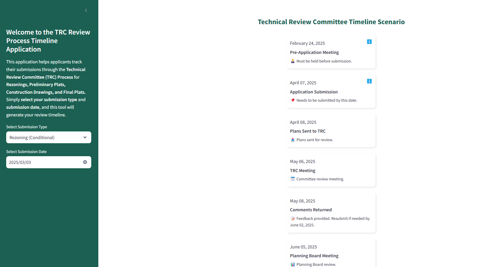 This application helps applicants track their submissions through the Technical Review Committee (TRC) Process for Rezonings, Preliminary Plats, Construction Drawings, and Final Plats. Simply select your submission type and submission date, and this tool will generate your review timeline.This application helps applicants track their submissions through the Technical Review Committee (TRC) Process for Rezonings, Preliminary Plats, Construction Drawings, and Final Plats. Simply select your submission type and submission date, and this tool will generate your review timeline.